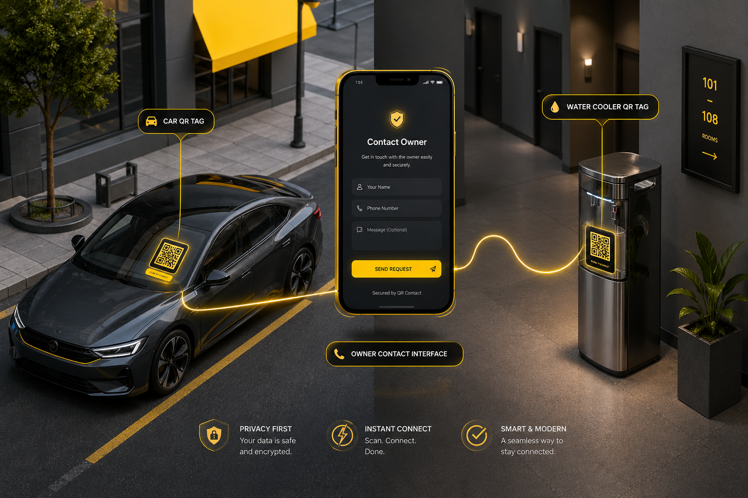 JankariTag puts a secure QR code on your car, water cooler, or shop front. Anyone can contact you in seconds — without ever seeing your phone number.